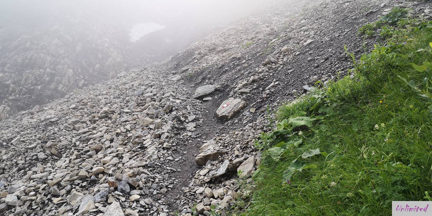 Der Aufstieg zur Mädelegabel war ebenfalls nicht markiert, aber aus den Beschreibungen wussten wir, dass man sich am Grat halten sollte, der die Schwierigkeit UIAA II nicht überschreiten, aber schön ausgesetzt sein sollte. Dank der dicken Suppe bekamen wir von der Ausgesetztheit nichts mit. 😅 |