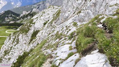Die Orientierung war dank der durchgängig gelegten Fixseile gar kein Problem. 😃 Wir folgten der Rampe bis in der folgenden Verschneidung eine Stufe steil nach oben ging, so dass wir auf einem kleinen Podest standen. Dort waren sogar mehrere Fixseile zu einem richtigen Fix"zopf" verbunden, was sich im Abstieg später als sehr hilfreich herausstellte. Zwei beherzte Züge später standen wir auf einer begrünten Plattform. Das Gipfelkreuz war bereits in Sicht. Davor lag lediglich noch eine steile Plattenquerung, an der ebenfalls ein Fixseil angebracht war.  |